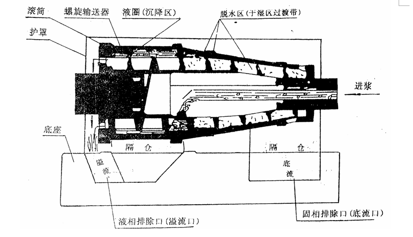 一、工作流程:離心機(jī)工作時(shí),鉆井液通過一根插入螺旋輸送器空心軸內(nèi)的進(jìn)液管進(jìn)入離心機(jī),首選在離心機(jī)內(nèi)被加速,然后經(jīng)空心軸上的噴液孔再進(jìn)入高速旋轉(zhuǎn)的轉(zhuǎn)鼓內(nèi),在離心力的作用下,由于離心機(jī)作用,產(chǎn)生離心力,位于液圈的外層,緊貼于轉(zhuǎn)鼓內(nèi)壁形成固相層,液圈的內(nèi)層最主要是液相和懸浮的膠體粘土。螺旋輸送器的刮板將貼于內(nèi)壁上的固相層,刮下來推向轉(zhuǎn)鼓脫水區(qū)。在脫水區(qū)有如洗衣機(jī)的甩干筒一樣濕淋淋的固相顆粒受到離心擠壓和離心脫水的作用,擠出所有的自由水,然后被螺旋輸送器推到轉(zhuǎn)鼓小端的底流嘴排出機(jī)體外。液圈內(nèi)層的液相和懸浮的超細(xì)顆粒由推進(jìn)器刮向轉(zhuǎn)鼓大端,由大端上的幾個(gè)滴流孔排出機(jī)體外。返回到泥漿循環(huán)系統(tǒng)。